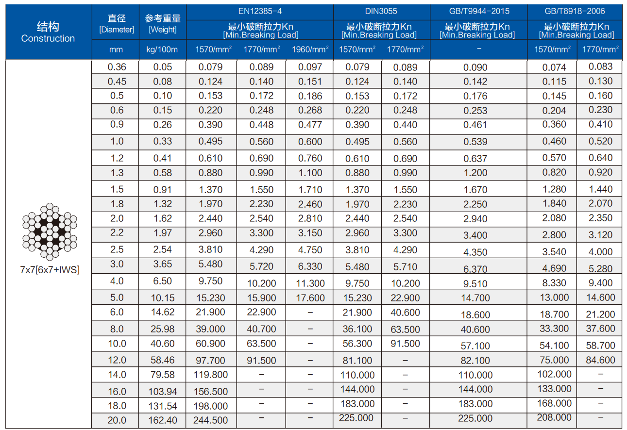 7x7 stainless steel wire rope consists of 7 strands each consisting of 7 single wires, all wires in all strands has same diameter. 7x7 wire rope is more flexible than 1x19 but more rigid than 7x19, 7x7 wire rope is often used where 1 x 19 lacks enough flexibility or where 7 x 19 wire rope doesn't have the strength. This particular wire rope is mainly used within the marine and engineering applications. More uses of this wire rope can be with cable cars, guardrails, rigging, marine and sewage en